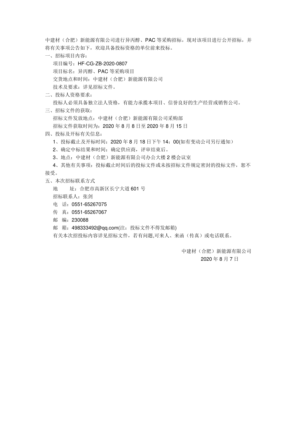 中建材(合肥)新能源有限公司进行异丙醇、PAC等采购公开招标