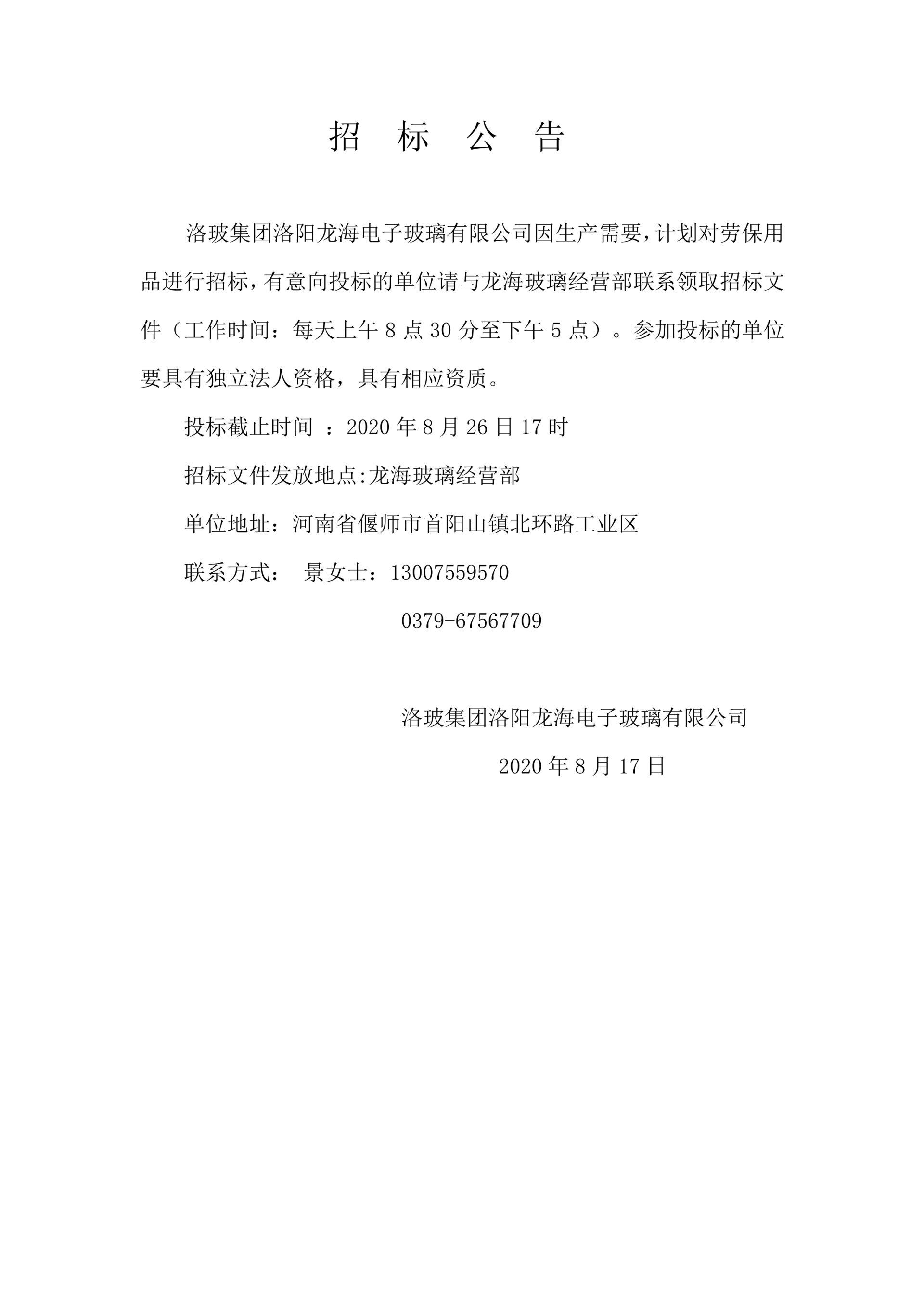 洛玻集团洛阳龙海电子玻璃有限公司劳保用品招标公告