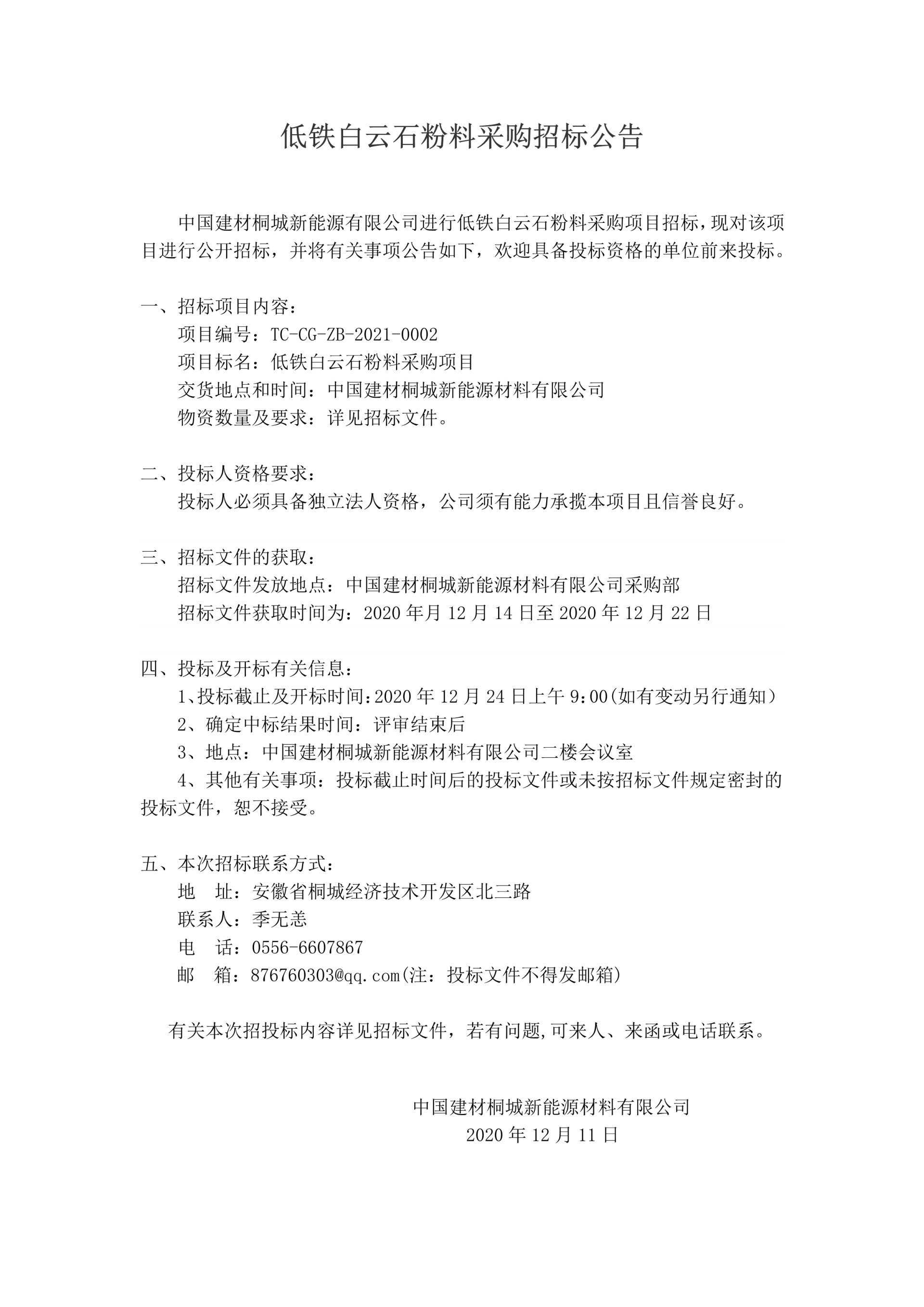 中国建材桐城新能源有限公司低铁白云石粉料采购项目招标公告