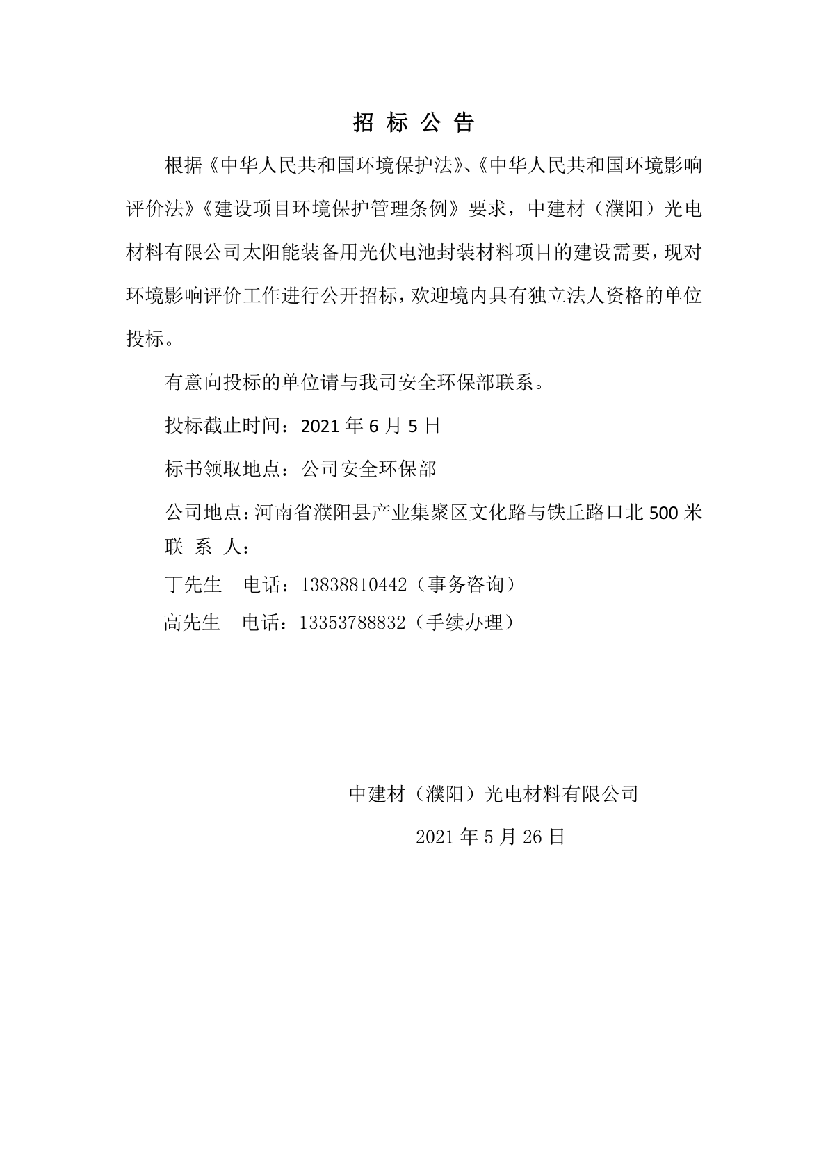 中建材(濮阳)光电材料有限公司太阳能装备用光伏电池封装材料项目环境影响评价工作招标公告