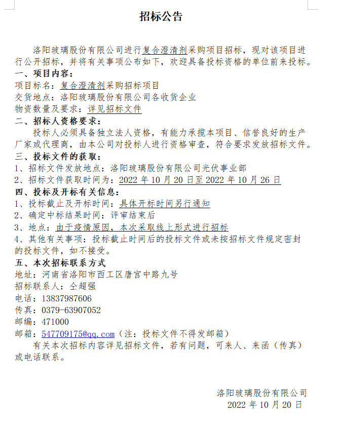 洛阳玻璃股份有限公司复合澄清剂采购项目招标公告