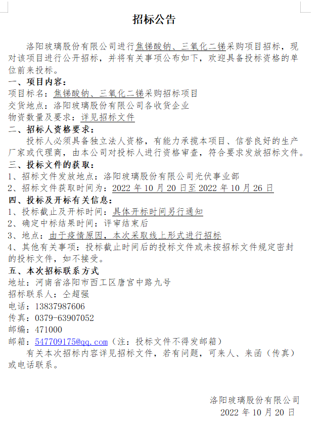 洛阳玻璃股份有限公司焦锑酸钠、三氧化二锑采购项目招标