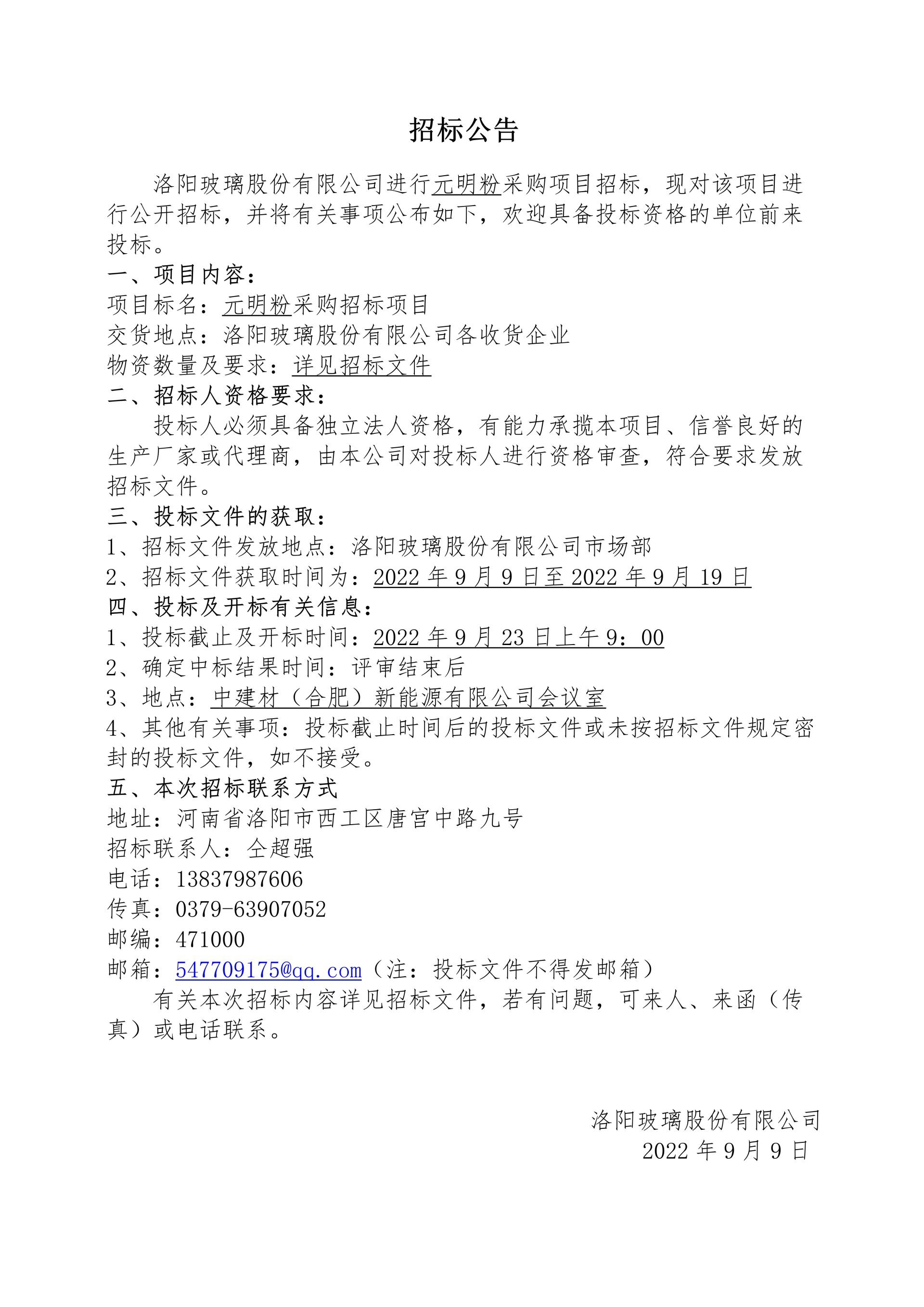 洛阳玻璃股份有限公司元明粉采购项目招标公告