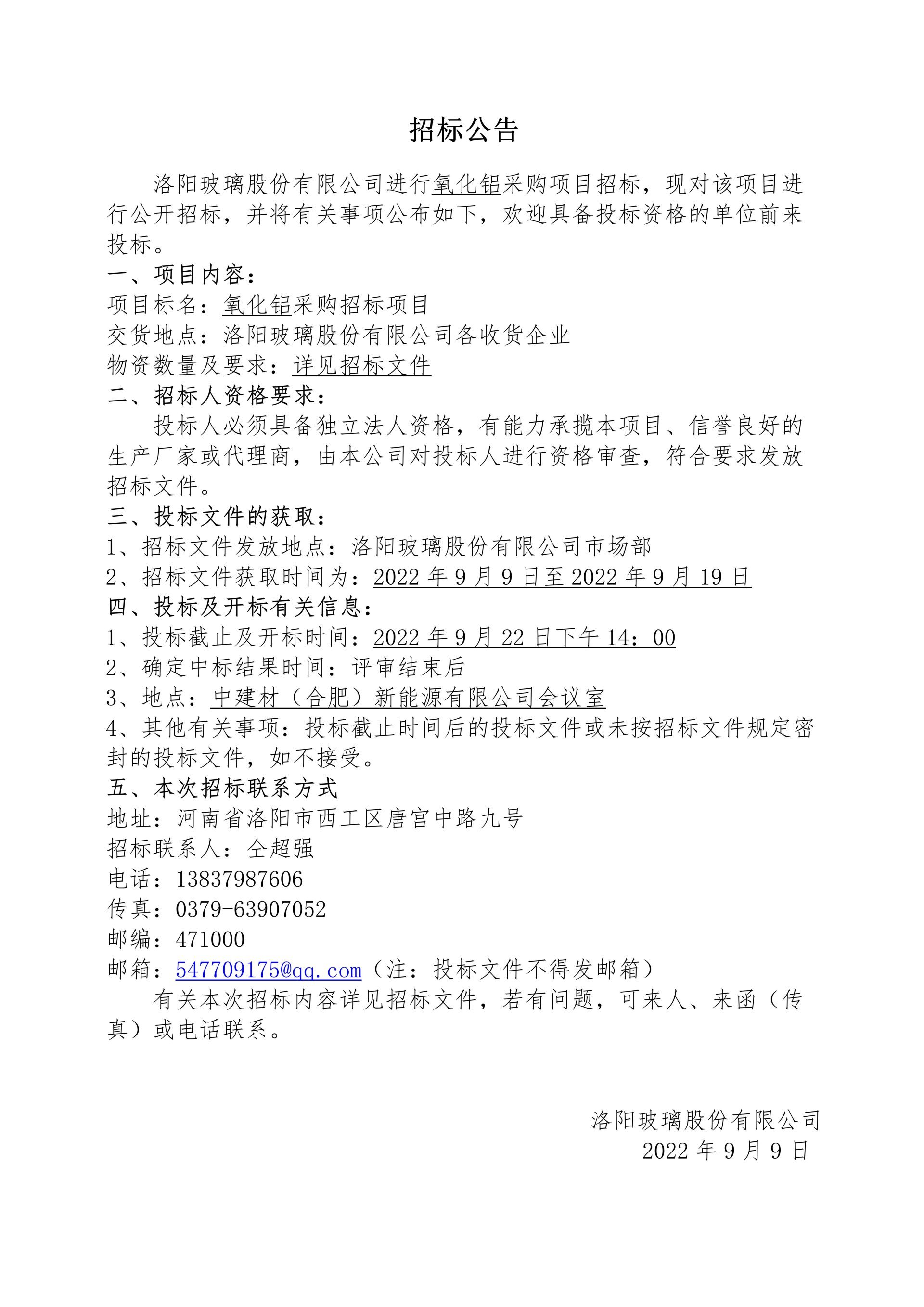 洛阳玻璃股份有限公司氧化铝采购项目招标公告
