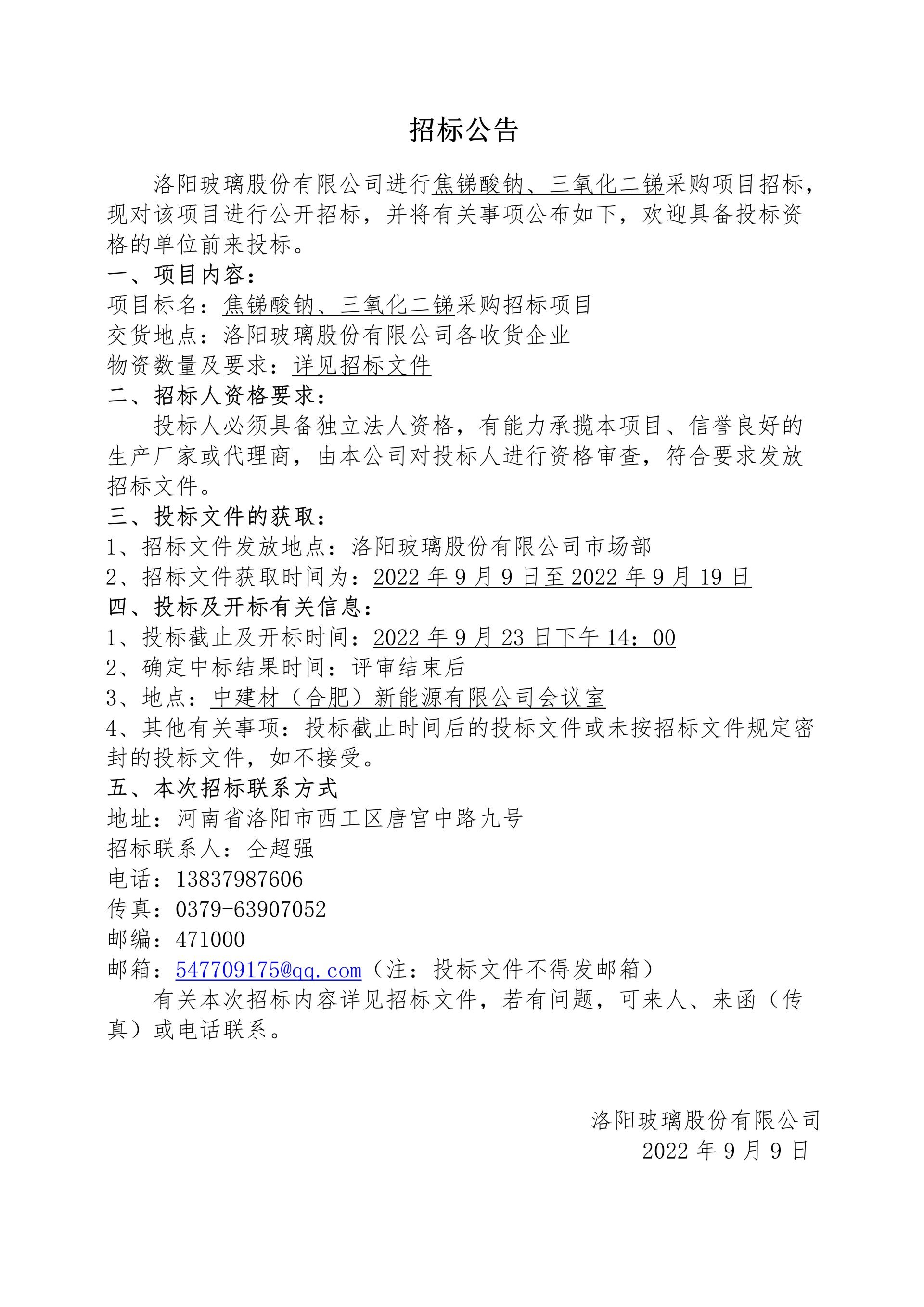 洛阳玻璃股份有限公司焦锑酸钠、三氧化二锑采购项目招标公告