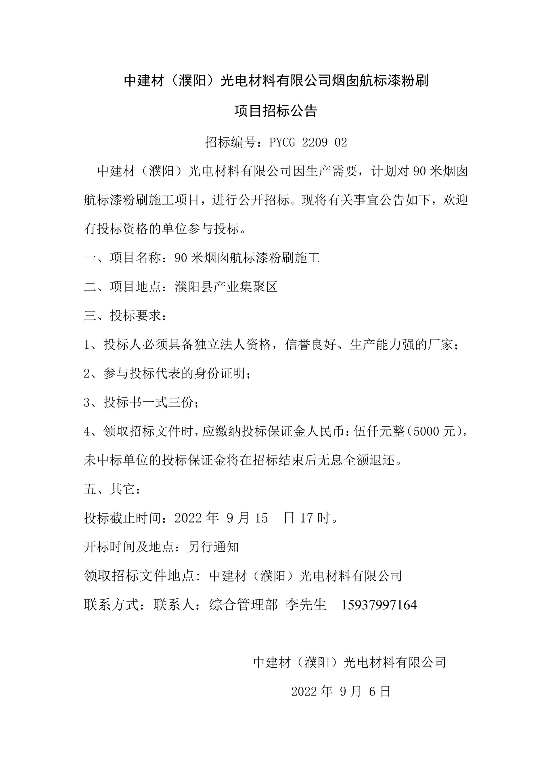 中建材(濮阳)光电材料有限公司烟囱航标漆粉刷项目招标公告