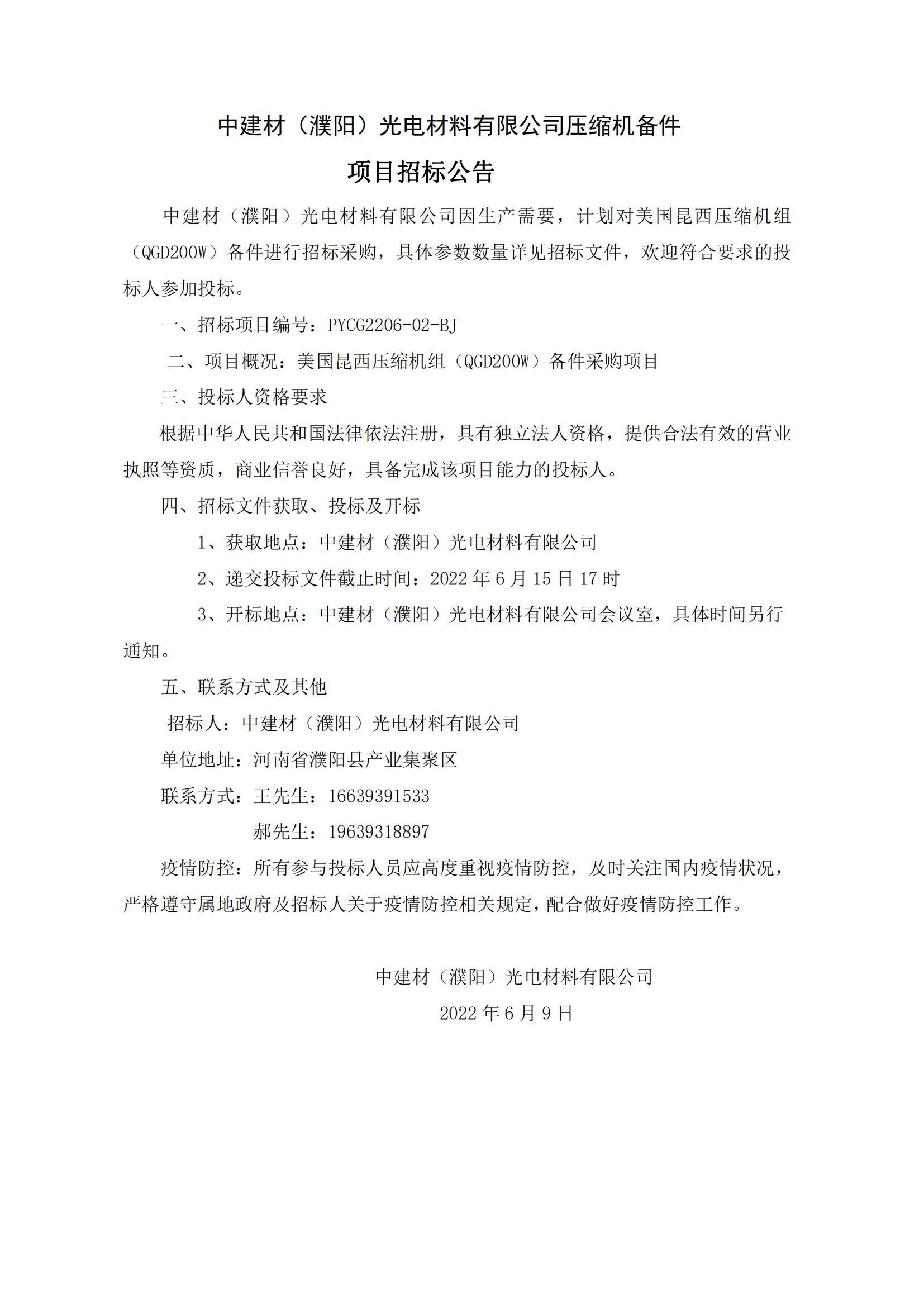中建材(濮阳)光电材料有限公司昆西压缩机备件项目招标公告